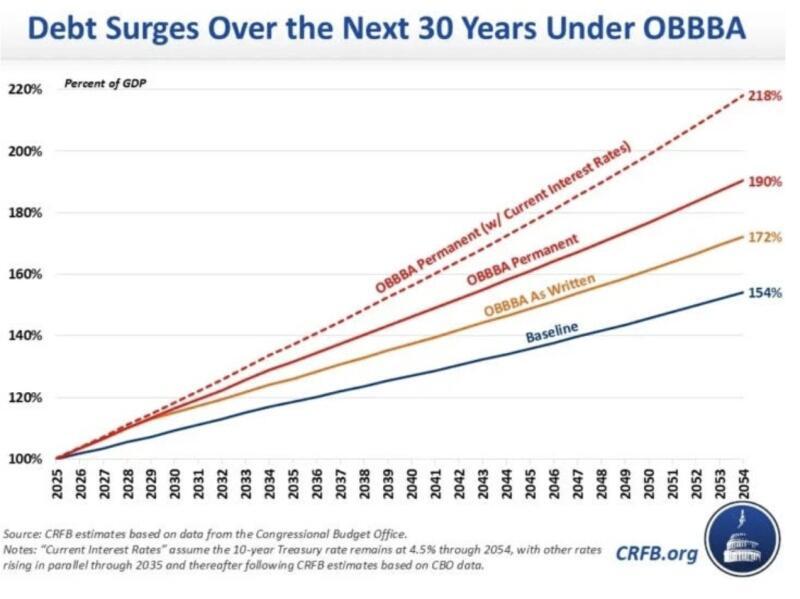 Not the Trumpified GOP, however. Again, as we showed yesterday, the Donald’s OBBBA—even with the egregious budget gimmick of terminating new tax cuts and bennies in the 2028 election year to make the cost look lower on the standard 10-year window—would add massively to the public debt.