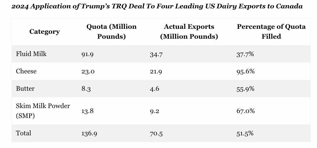 Well, no, in 2024 Canada did not collect one single Canadian dollar or US dollar or even plug nickel of tariff revenue from US dairy exporters of the four leading dairy export products—fluid milk, butter, cheese and powder milk. That’s right, the tariff on US dairy exports of these four products was zero, nichts, nada and nothing, respectively.