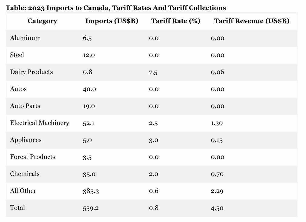 As is evident from the second column and total at the bottom, Canada is the very opposite of a big time tariff collector. In fact, the average tariff on all products in 2023 was, well, 0.8%.