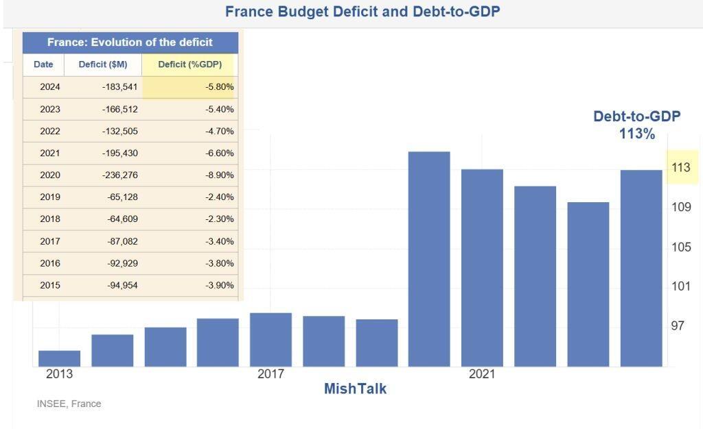 Debt-to-GDP courtesy of Trading Economics, Deficit insert from https://countryeconomy.com/deficit/france