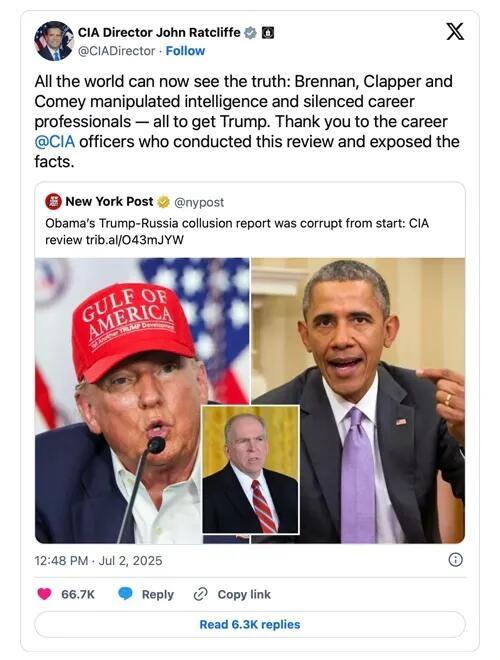 My theory is that a whole lot of other matters had to be cleared out of the way first. And now, that is pretty much where we’re at. Mr. Ratcliffe, formerly Director of National Intelligence (in Trump One) and now Director of the CIA, also knows all the names. He’s been as quiet as a tick on a wild hog lo these many months, but on Wednesday he issued quite a squawk, in the public arena of X, no less, along with a report by trusted agency colleagues titled (nontoxically) Tradecraft Review 2016 ICA on Election Interference 062625.
