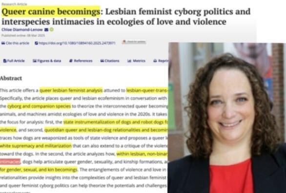 Published March 8 in the Journal of Lesbian Studies, the title of the analysis is “Queer canine becomings: Lesbian feminist cyborg politics and interspecies intimacies in ecologies of love and violence.”