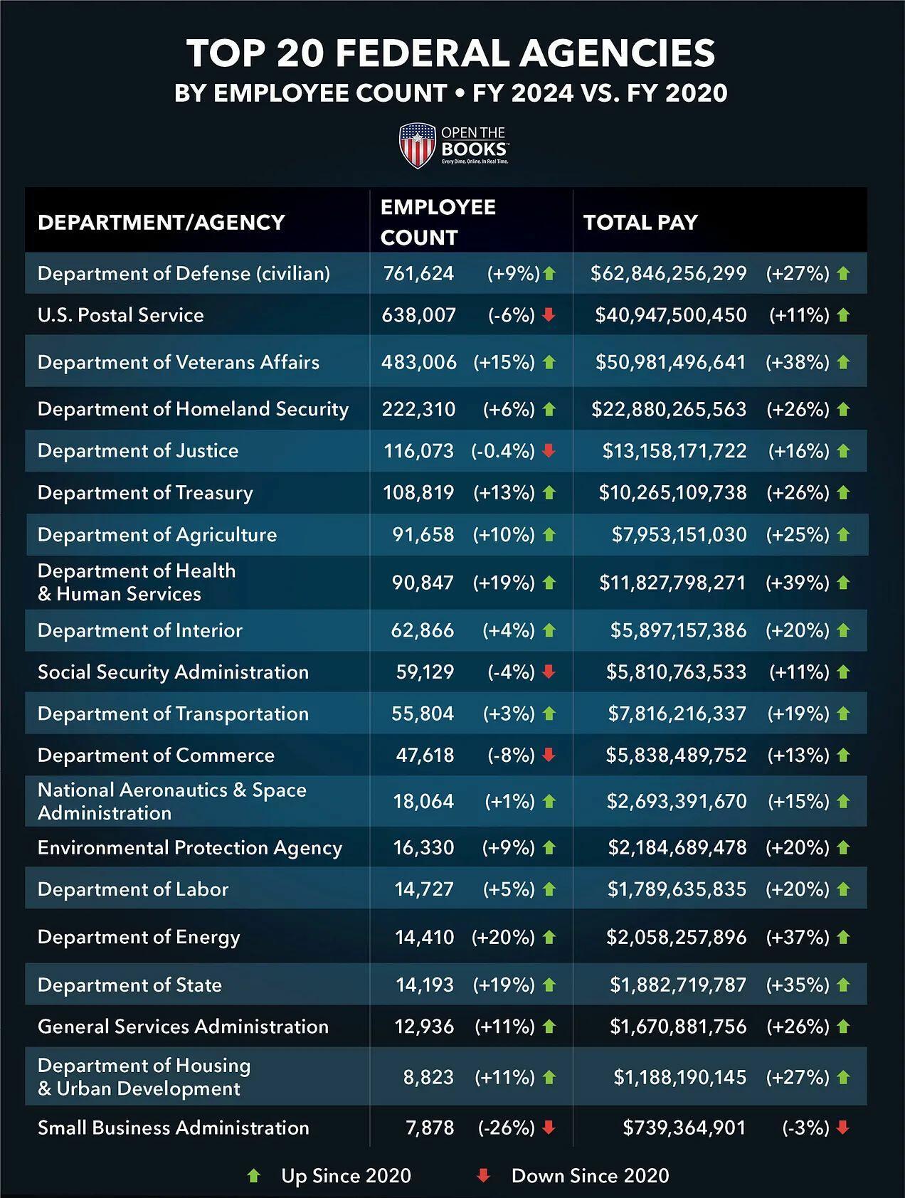 Open the Books analyzed the FY 2024 payroll records of executive agencies and found that 2.9 million federal employees were paid $270 billion, compared to 2.8 million employees paid $217 billion in FY 2020. While the civilian employee ranks grew 5%, pay grew nearly 5 times as much, 24%.