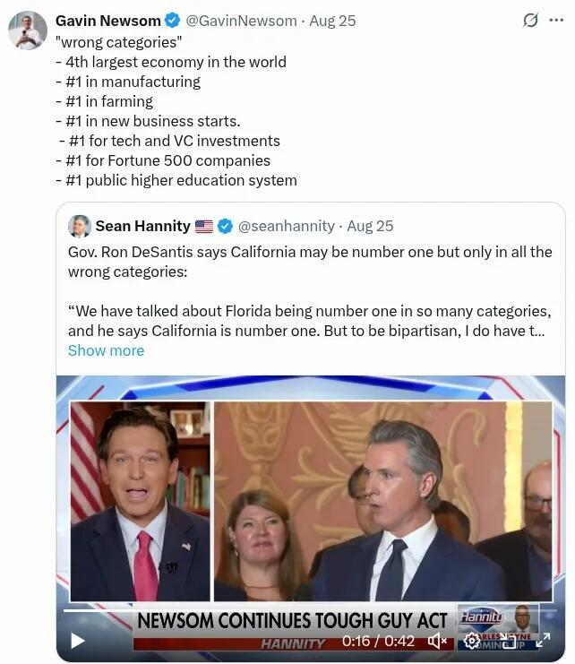 This is in response to Ron DeSantis pointing out that, among other things, California is #1 in homelessness and poverty. This is somewhat normal politician-speak, but none of his positive things have anything to do with Gavin Newsom and are primarily simply that California has about 1/3rd more population to the next closest state and is also the major gateway to the Pacific.