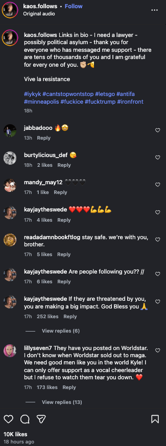 This guy calls himself Kyle, says he’s Antifa, and is on the street in Minneapolis right now near where the anti-ICE attacker got gunned down today.