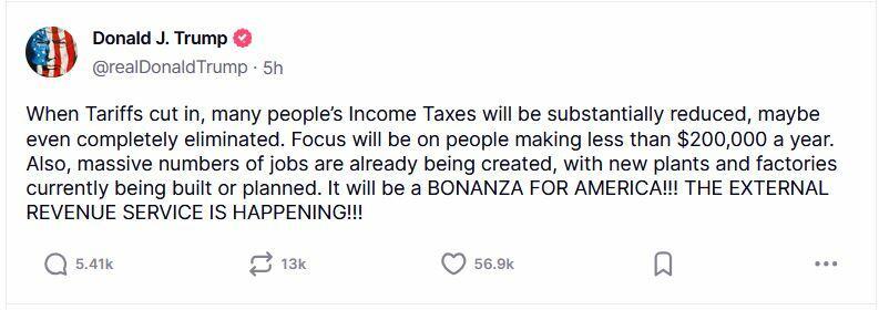“When Tariffs cut in, many people’s Income Taxes will be substantially reduced, maybe even completely eliminated. Focus will be on people making less than $200,000 a year,” Trump wrote.
