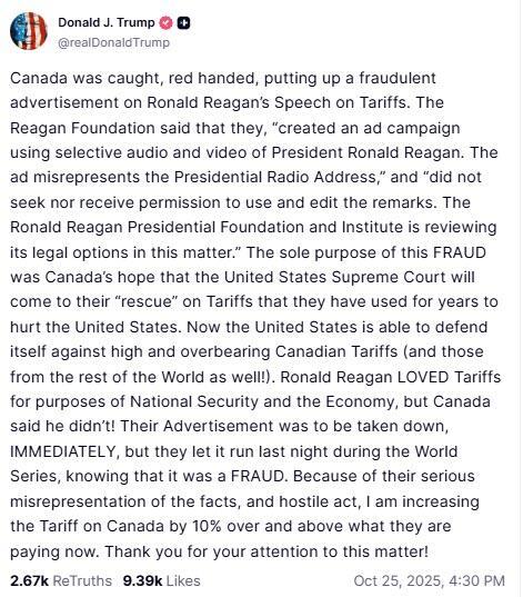 “Their Advertisement was to be taken down, IMMEDIATELY, but they let it run last night during the World Series, knowing that it was a FRAUD. Because of their serious misrepresentation of the facts, and hostile act, I am increasing the Tariff on Canada by 10% over and above what they are paying now.”