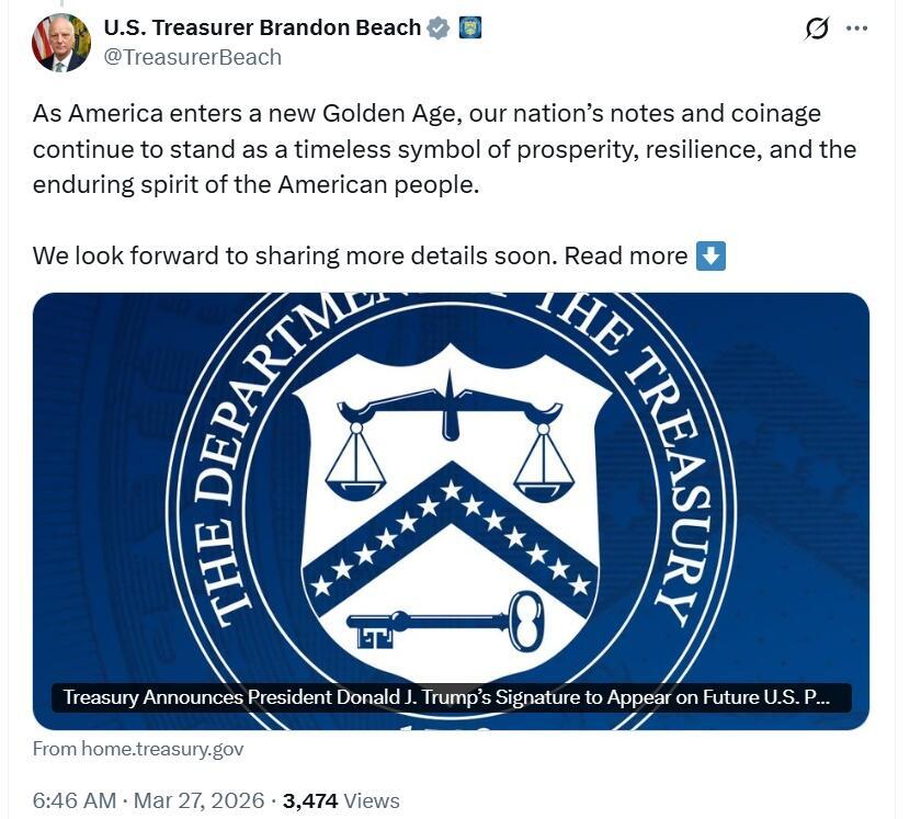 It will put both Trump and Treasury Secretary Scott Bessent’s signatures on future US notes.