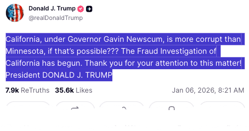 "California, under Governor Gavin Newscum, is more corrupt than Minnesota, if that's possible??? The fraud investigation of California has begun. Thank you for your attention to this matter!" Trump wrote on Truth Social on Tuesday.
