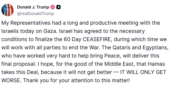 “My Representatives had a long and productive meeting with the Israelis today on Gaza. Israel has agreed to the necessary conditions to finalize the 60 Day CEASEFIRE, during which time we will work with all parties to end the War,” Trump wrote, saying the Qataris and Egyptians would deliver the final proposal.