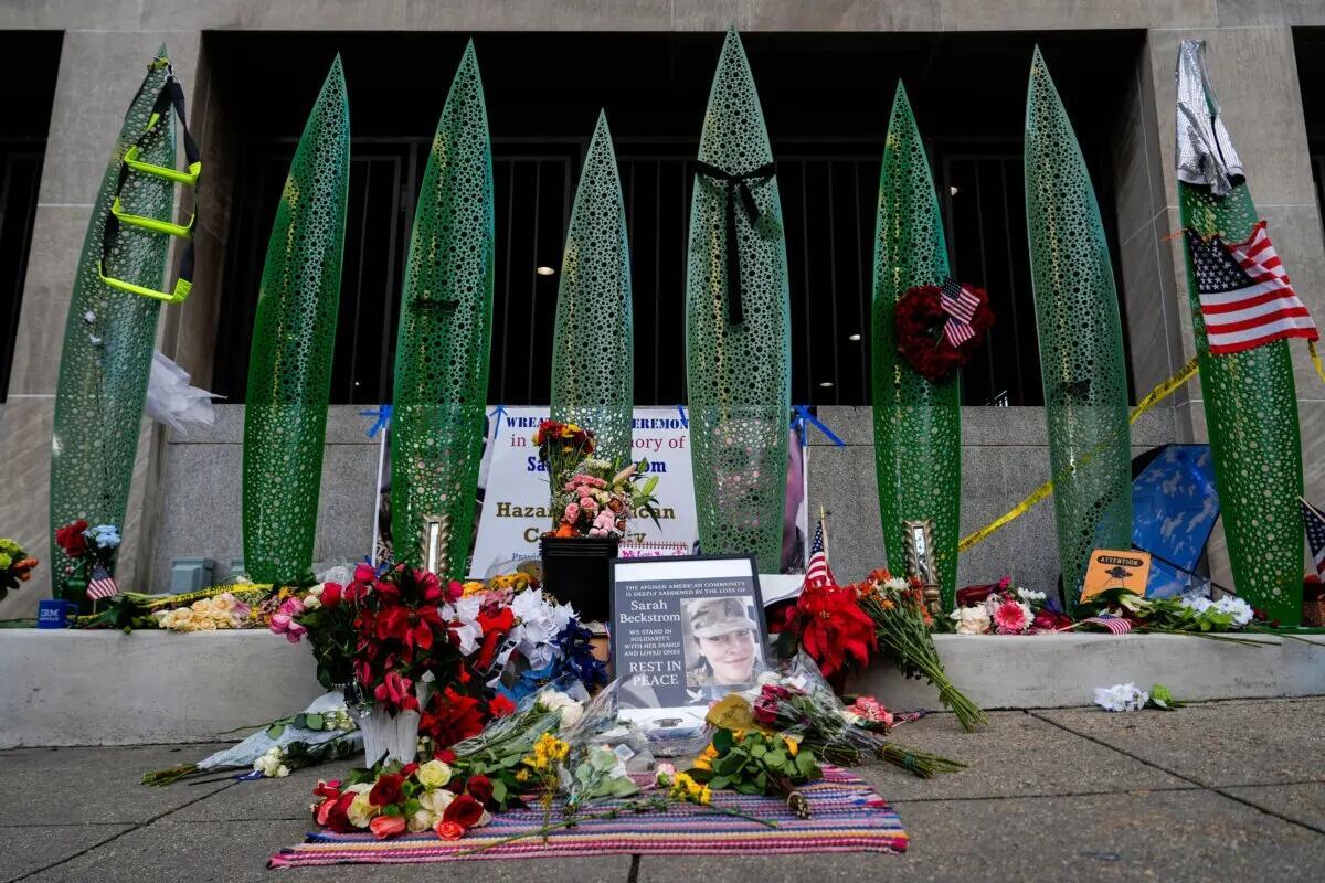 A makeshift memorial for U.S. Army Spc. Sarah Beckstrom and U.S. Air Force Staff Sgt. Andrew Wolfe outside of Farragut West Station, near the site where the two National Guard members were shot, in Washington on Dec. 1, 2025. Julia Demaree Nikhinson/AP Photo