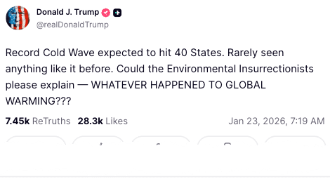 Earlier today, Trump on Truth Social said, "Record Cold Wave expected to hit 40 States. Rarely seen anything like it before. Could the Environmental Insurrectionists please explain — WHATEVER HAPPENED TO GLOBAL WARMING???"
