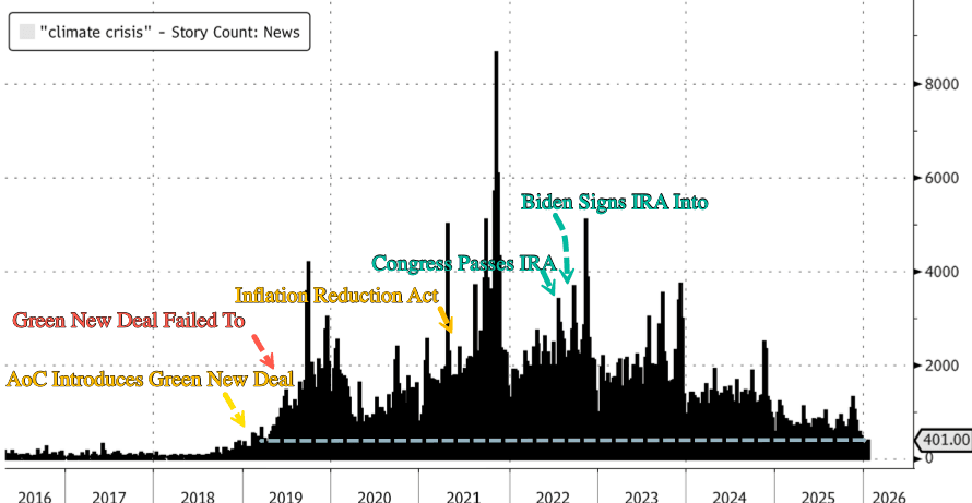 As shown in the Bloomberg data below, as soon as the climate bill was passed and taxpayer funds flooded the green industry and NGOs by the tens of billions of dollars, the narrative of the world on fire because of cow farts and Taylor Swift's private jet almost disappeared.