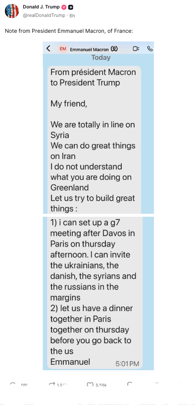 Trump posted what appears to be a private message from Macron on Truth Social, in which the French president wrote, "We are totally in line on Syria. We can do great things on Iran. I do not understand what you are doing on Greenland."