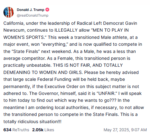 Trump Threatens To Withhold "Large Scale" Federal Funding From California After Trans Athlete Destroys Biological Females