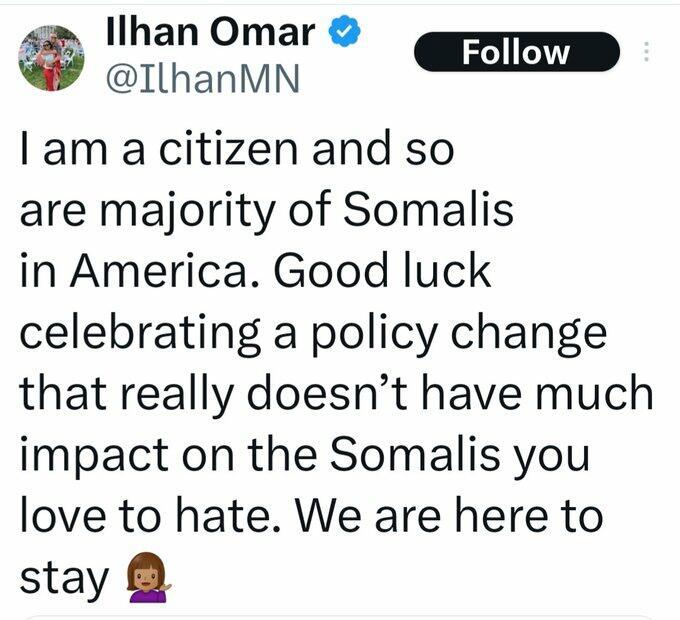 US House Representative Ilhan Omar claims Trump "doesn't understand the laws" on TPS, for example, and argues that the vast majority of Somali migrants are safe from deportation.