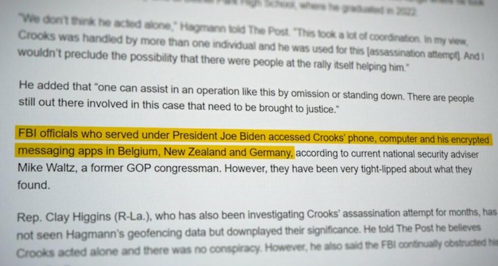 - Biden FBI officials accessed Crooks' phone using software from an Israeli firm, Cellebrite, and accessed his phone, computer and his encrypted messaging apps in Belgium, New Zealand and Germany - "yet none of the online activity the FBI discovered was referred to in any way in the final Congressional report."