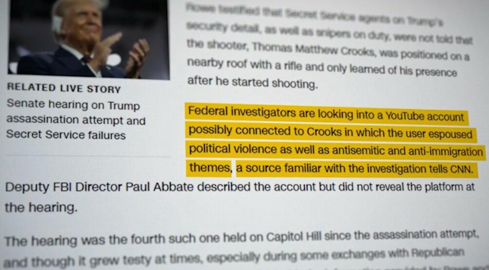 Two and a half weeks after the attack, a 'source familiar with the investigation' told CNN that "Federal investigators are looking into a YouTube account possibly connected to Crooks in which the user espoused political violence as well as antisemitic and anti-immigration themes."
