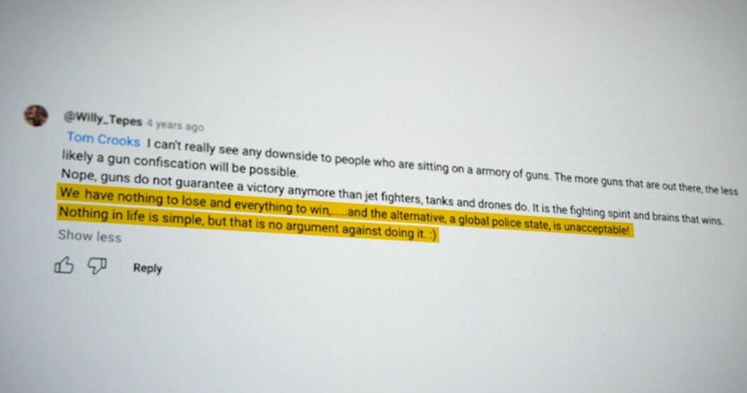 Then - a YouTube user @Willy_Tepes began seemingly encouraging Crooks... writing "If a gun and a badge is all that is needed, then authority obviously comes from the barrel of a gun. We have more guns than they do ;)"
