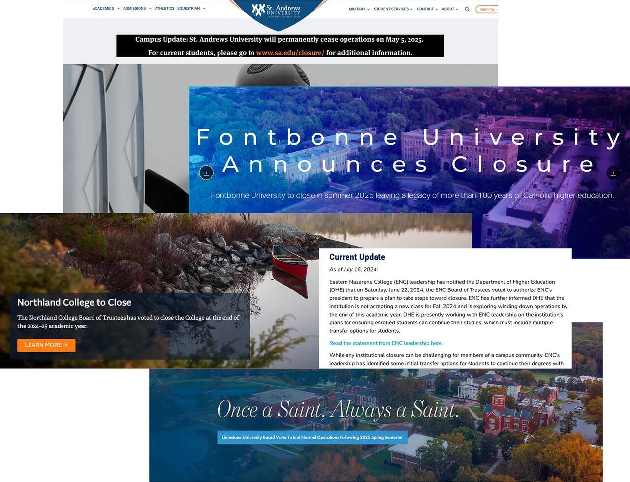 The list of 2025 closures includes St. Andrews University in North Carolina, Limestone University in South Carolina, Eastern Nazarene College in Massachusetts, Fontbonne University in Missouri, Northland College in Wisconsin, and Paier College in Connecticut.