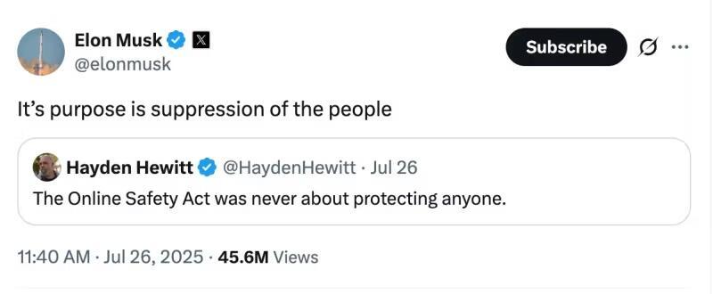 Elon Musk’s platform X has warned that the act risks “seriously infringing” on free speech, with the threat of fines up to £18 million or 10% of global annual turnover for non-compliance, encouraging platforms to censor legitimate content to avoid punishment. Musk took to X to express his personal view on the act’s true purpose: “suppression of the people.”