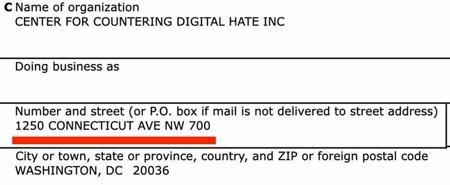 Note also that the CCDH company has a different address from the CCDH nonprofit, which states in its 990s that it operates from an office building at 1250 Connecticut Avenue, in Northwest DC.