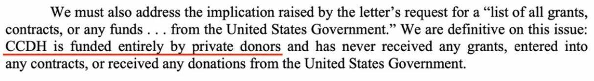 That claim is false, and providing false and misleading information to Congress is a crime. The British Telegraph reported last January that Members of Parliament were upset because the government had funded CCDH.
