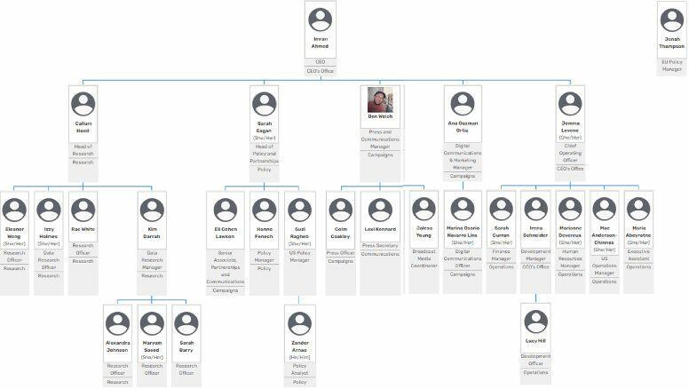 Since Morgan McSweeney and Imran Ahmed created CCDH, they have not only hidden the organization’s finances, but also who they employ. CCDH’s website currently shows only 6 employees. My whistleblower at CCDH sent me an organization chart that shows CCDH had 28 employees in the summer of 2024.