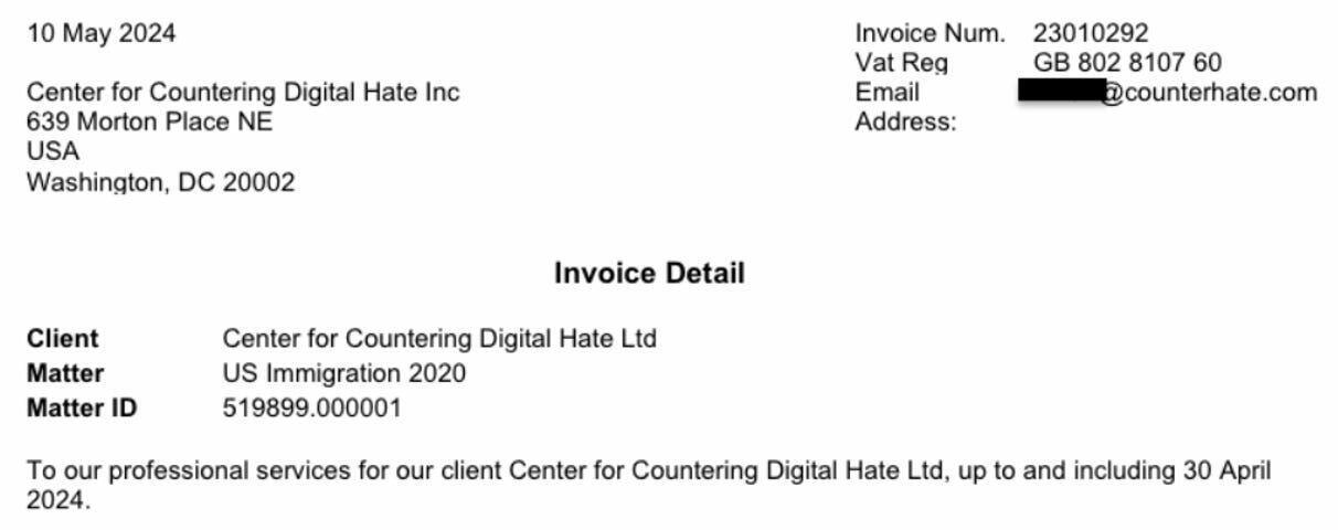Unlike the CCDH the nonprofit, CCDH Inc. (the private company) is not required to make its finances public. Yet I found that the CCDH nonprofit uses CCDH Inc. to pay the nonprofit’s bills. For example, when CCDH the nonprofit pays its law firm, the invoice is paid by the company, the Center for Countering Digital Hate Inc.