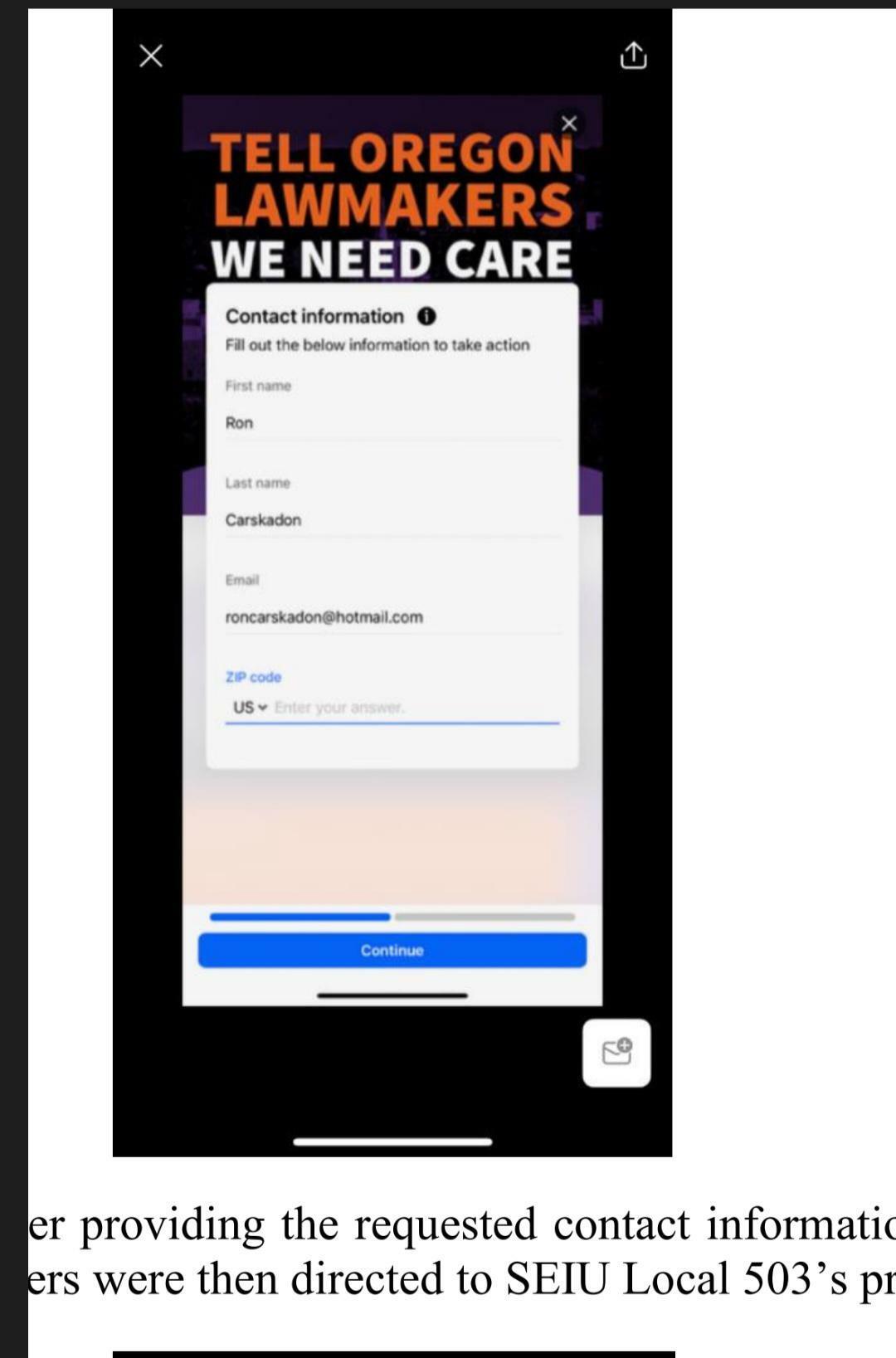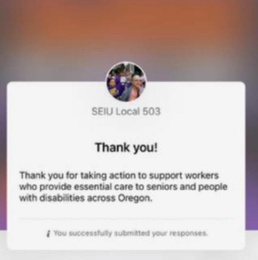 Carskadon, represented by the union's collective bargaining agreement with the state, also vocalized her opposition directly to Melissa Unger (SEIU Local 503’s executive director), while in-person at the Oregon State Capitol—long before SEIU Local 503 delivered the postcards to legislators.