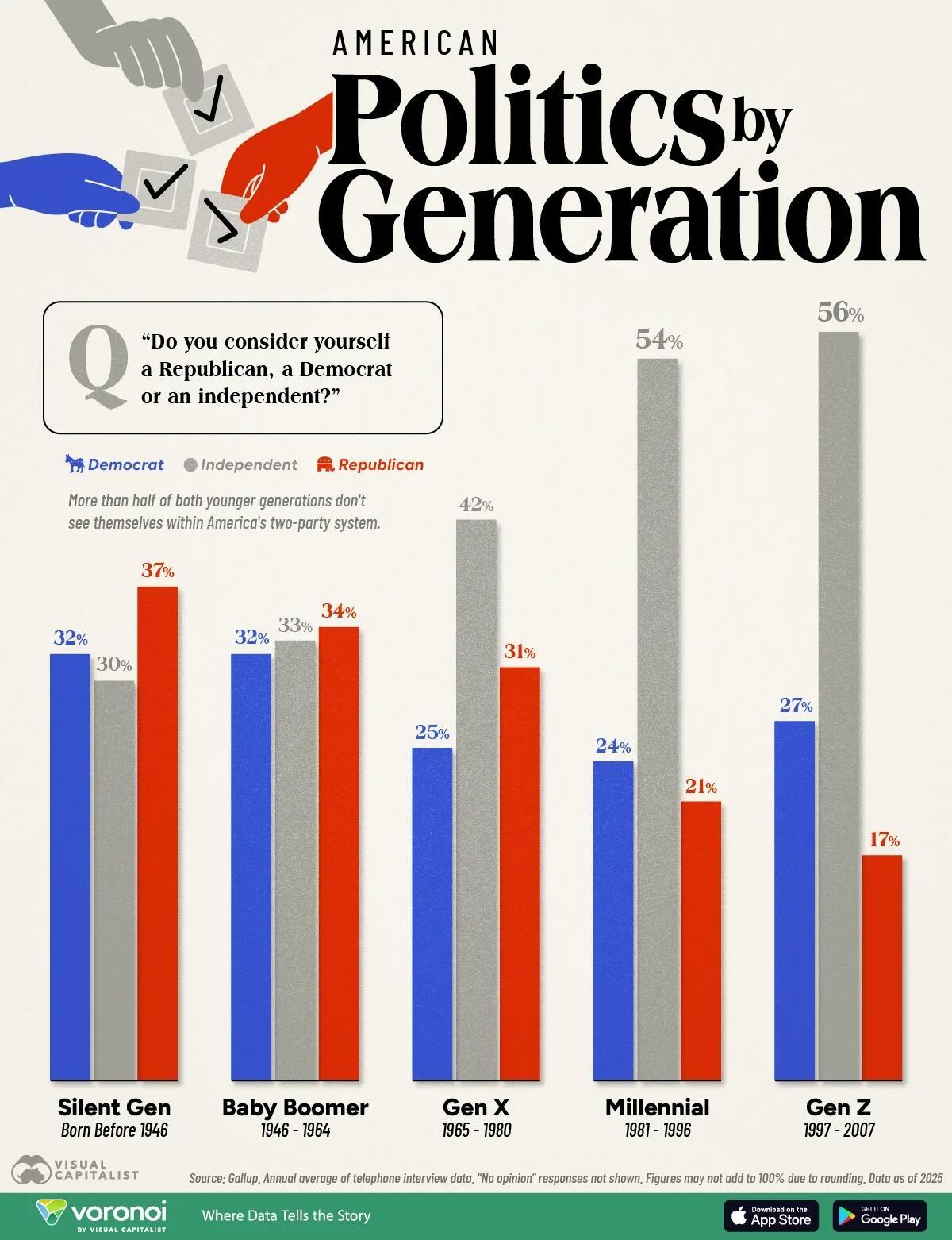 This visualization, via Visual Capitalist's Niccolo Conte, shows how political affiliation varies across generations, highlighting the growing role of independents in American politics.