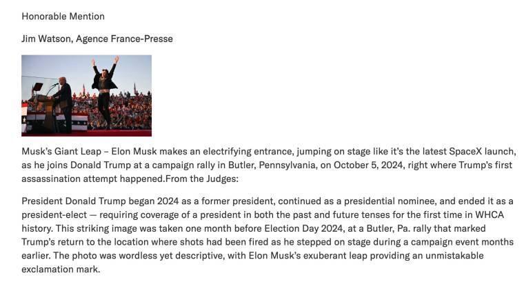 The Trump photo wasn’t even given an honorable mention. That went to a photo of Elon Musk jumping in the air with a grin on his face at the second Butler Trump rally.