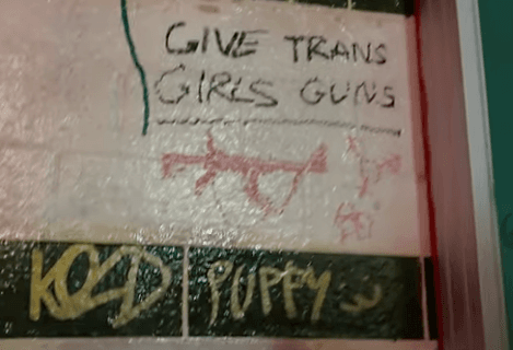 We grabbed a series of screenshots from the video, including text on the wall that said: "Give Trans Girls Guns."