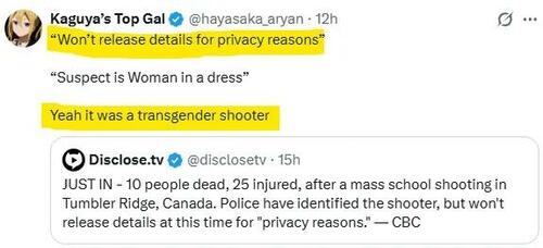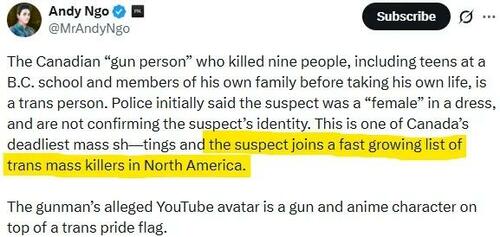 It gets worse. If you narrow the subset further to school shooters only—using the standard definition to include non-gang, non-accidental, multiple targeted victims—and suddenly 10% of the perpetrators in the last decade (two out of twenty) have identified as transgender. And if you look at just the past five years, when five of ten shooters were trans—this time, I’m including this week’s horror—that number skyrockets to fifty percent. But nothing to see here, folks. Trust us.