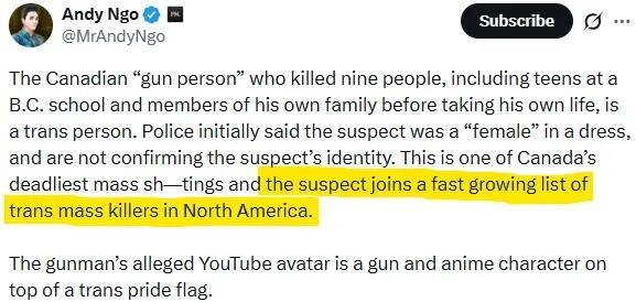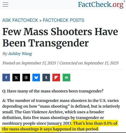Of course, this doesn’t prove causation. But what it absolutely disproves is the media’s favorite bedtime story: that it’s “baseless” or “bigoted” to notice a recurring theme. It isn’t. The pattern is real, documented, and growing. Yet the folks whose entire job it is to inform us will continue to chant their mantra that “trans people are far less violent than toxic cisgender men”—because they’d rather gargle broken glass than admit the monster under the bed is one they had a hand in feeding.