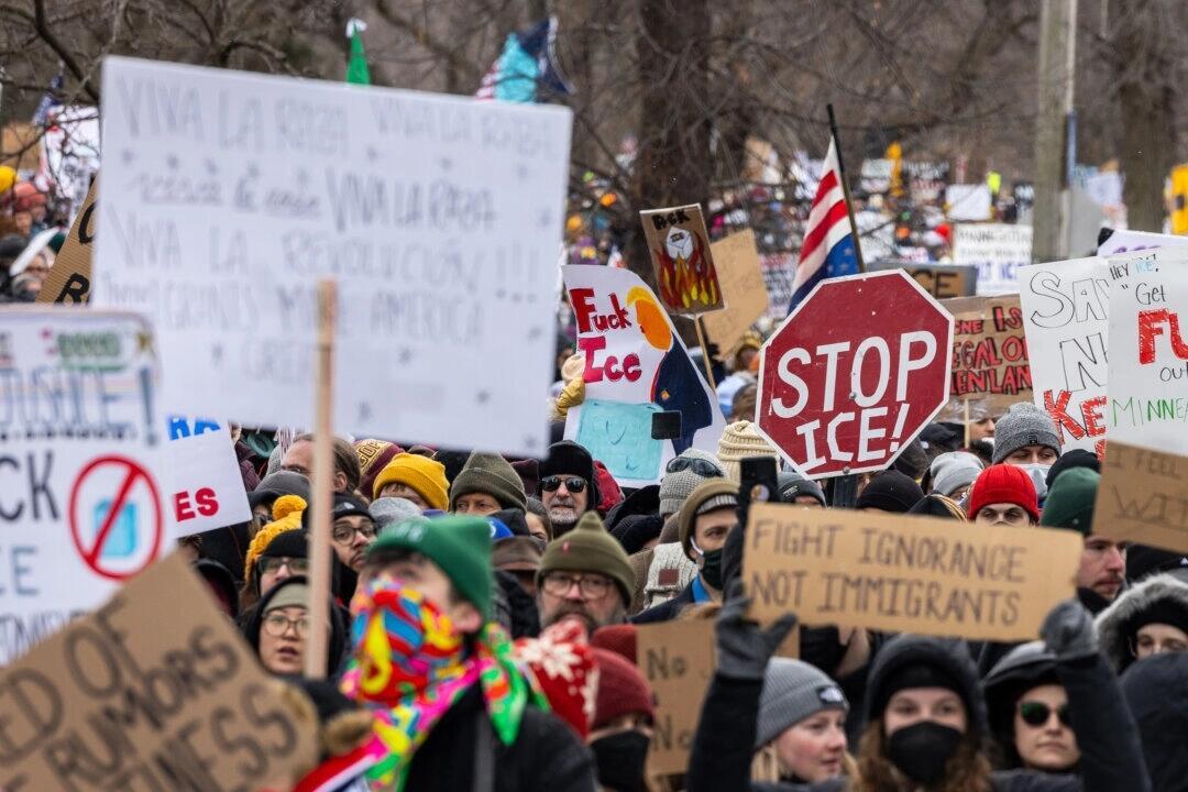 Protestors gather to demonstrate against Immigration and Customs Enforcement (ICE) operations in Minneapolis on Jan. 8, 2026. John Fredricks/The Epoch Times