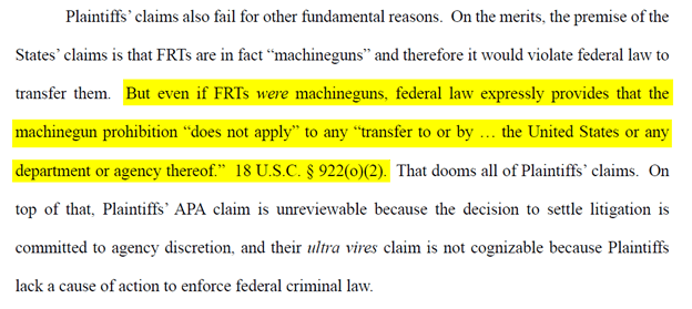 And in a filing in the case, the Department of Justice defended its return of FRTs. DOJ argued that, even if FRTs were machineguns, ATF could still give them back to their owners, because federal law doesn’t apply to the transfer of machineguns by the government.