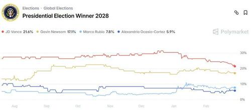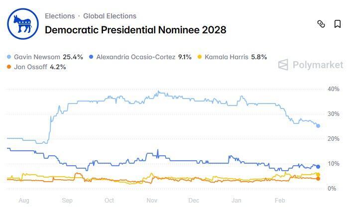 As Statista's Valentine Fourreau reports, according to data from prediction market platform Polymarket, Gavin Newsom is currently most likely to become the Democratic nominee for the 2028 presidential election with odds of over 25 percent as of February 23, 2026.