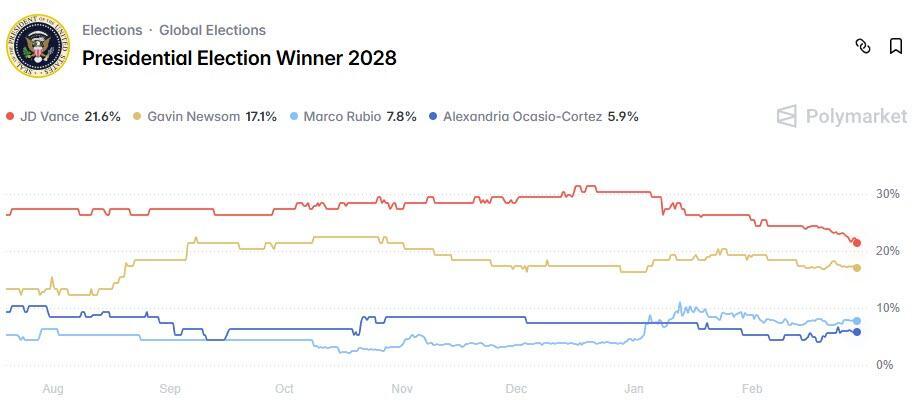 While Gavin Newsom so far appears as the clear favorite to represent the Democrats in the next election, Polymarket odds currently see him losing to VP J.D. Vance, with 17 percent against 22...