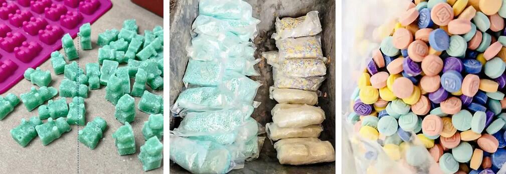 (Left) Police seize a new variety of fentanyl during a recent drug bust that had been molded into the shape of a gummy bear in Lethbridge, Canada. (Middle and Right) Customs and Border Protection seizes approximately 47,000 rainbow-colored fentanyl pills, 186,000 blue fentanyl pills, and 6.5 pounds of methamphetamine hidden in the floor compartment of a vehicle at the port of entry on the U.S.–Mexico border in Nogales, Ariz., on Sept. 3, 2022. Lethbridge Police Service, U.S. Customs and Border Protection