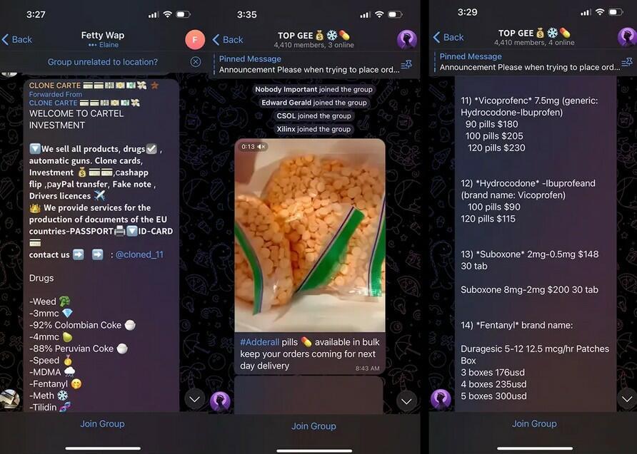 Screenshots from the Telegram app show alleged drug dealings on June 28, 2023. Experts say more dealers are turning to social media for its relative anonymity and perceived legal immunity. Screenshots via The Epoch Times, Telegram