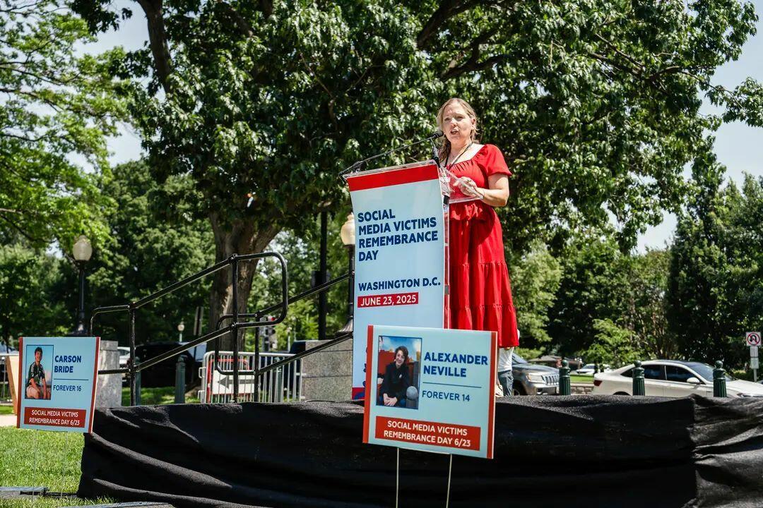 Amy Neville, whose 14-year-old son Alexander died from fentanyl poisoning after buying a pill on Snapchat, speaks during Social Media Victims Remembrance Day at Upper Senate Park on Capitol Hill in Washington on June 23, 2025. Madalina Kilroy/The Epoch Times