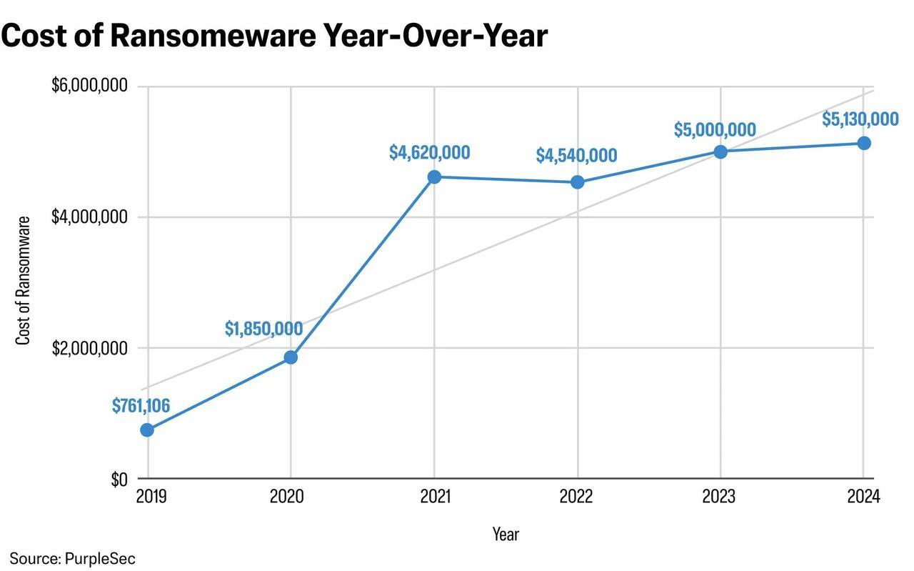 The average cost to the victim of a ransomware attack has risen from $761,106 in 2019 to an estimated $5.13 million in 2025, according toPurpleSec, a U.S.-based cybersecurity company.
