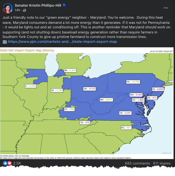 She said, "During this heat wave, Maryland consumers demand a lot more energy than it generates. If it was not for Pennsylvania - it would be lights out and air conditioning off," adding, "This is another reminder that Maryland should work on supporting (and not shutting down) baseload energy generation rather than require farmers in Southern York County to give up pristine farmland to construct more transmission lines."