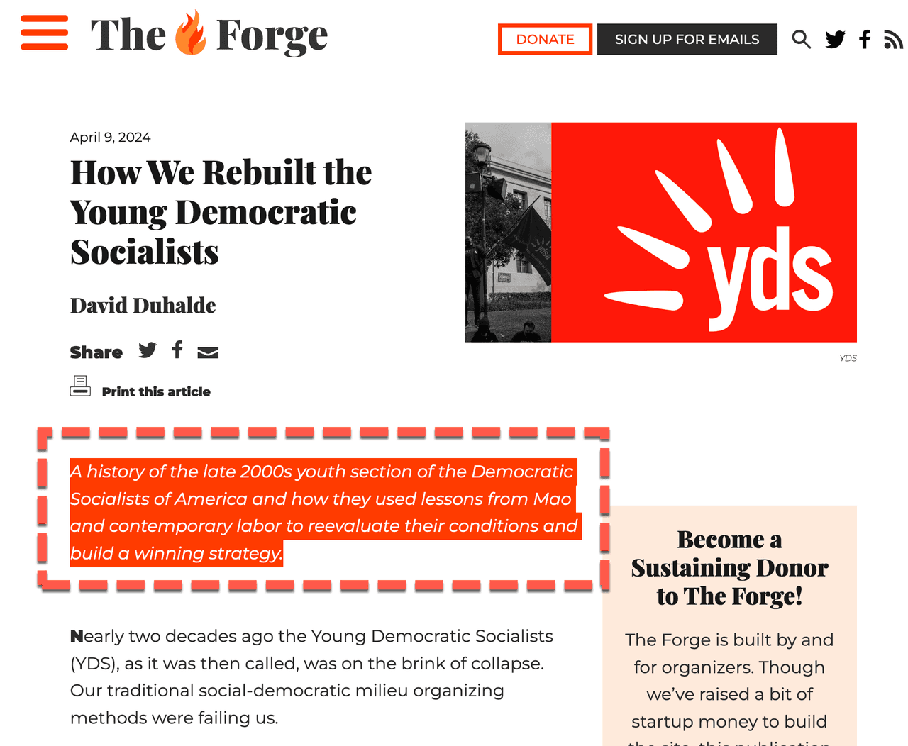 In 2024, Duhalde wrote, "A history of the late 2000s youth section of the Democratic Socialists of America and how they used lessons from Mao and contemporary labor to reevaluate their conditions and build a winning strategy."