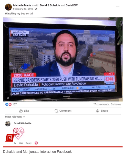 Further raising concerns, Duhalde's last-known romantic partner, Michelle Munjanattu, is a member of Samidoun, a front group for the Popular Front for the Liberation of Palestine (PFLP)—a U.S.-designated terrorist organization, according to Anderson.
