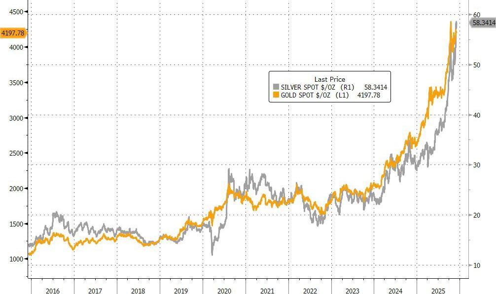 Over 10 years, the price of gold has moved from $1.1K per ounce to $4.2K, a 256 percent increase. The price of silver has moved from $13 to $57 per ounce, a 315 percent increase.