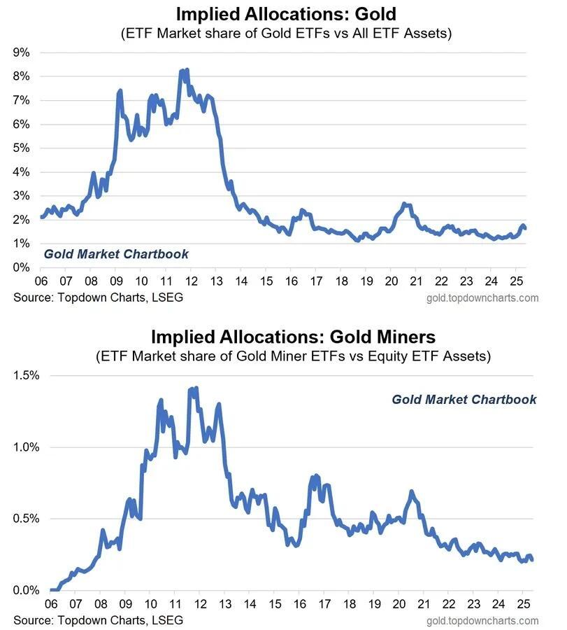 After the past year’s epic run, you’d think gold would have displaced at least some other assets in mainstream investors’ portfolios. But apparently not. These two charts have been making the rounds on X, showing that during the previous decade’s gold bull market, gold-related ETFs saw their share of “implied allocations” rise dramatically.