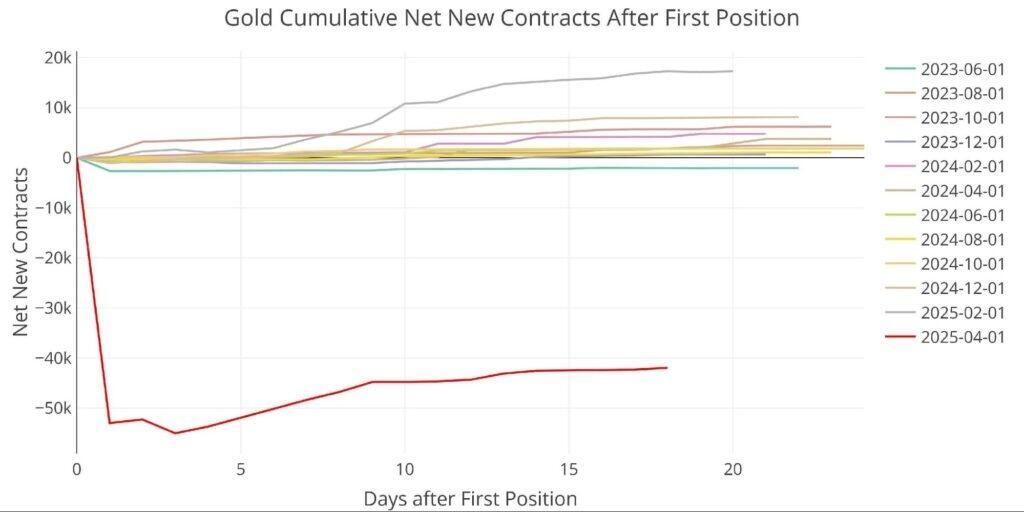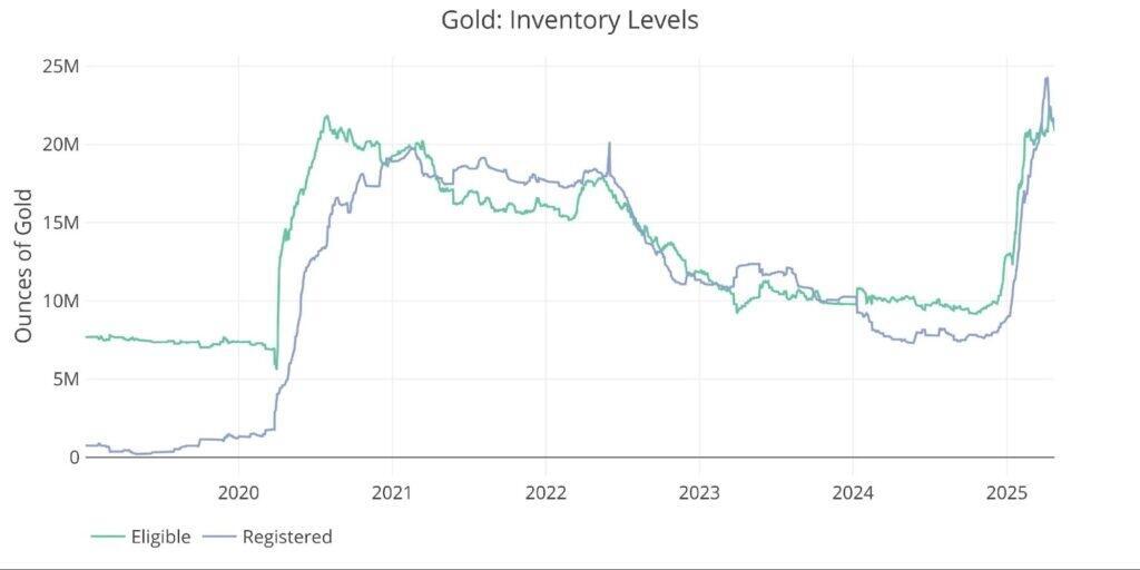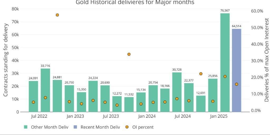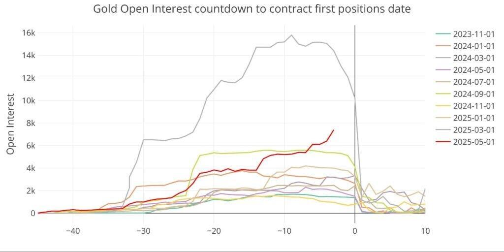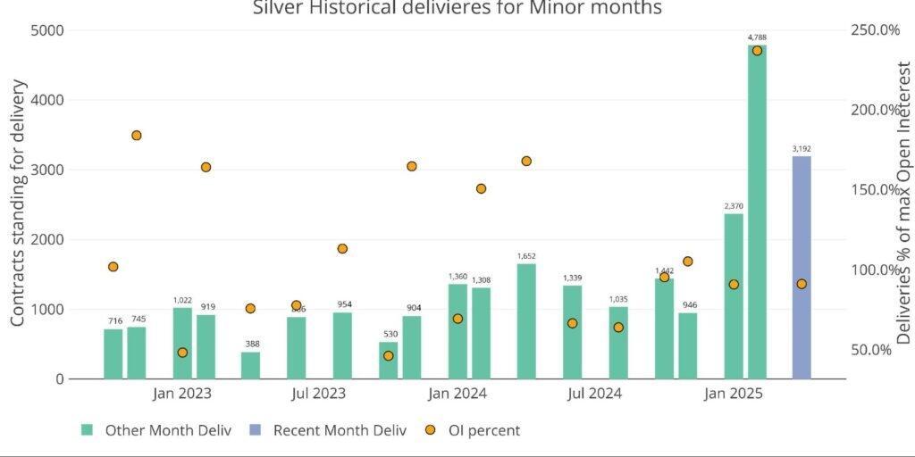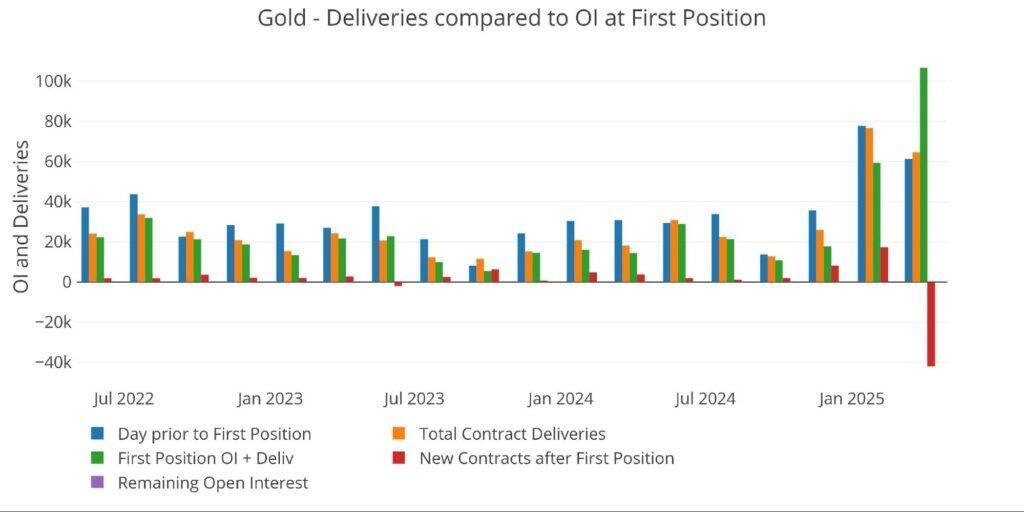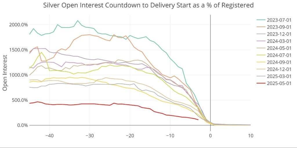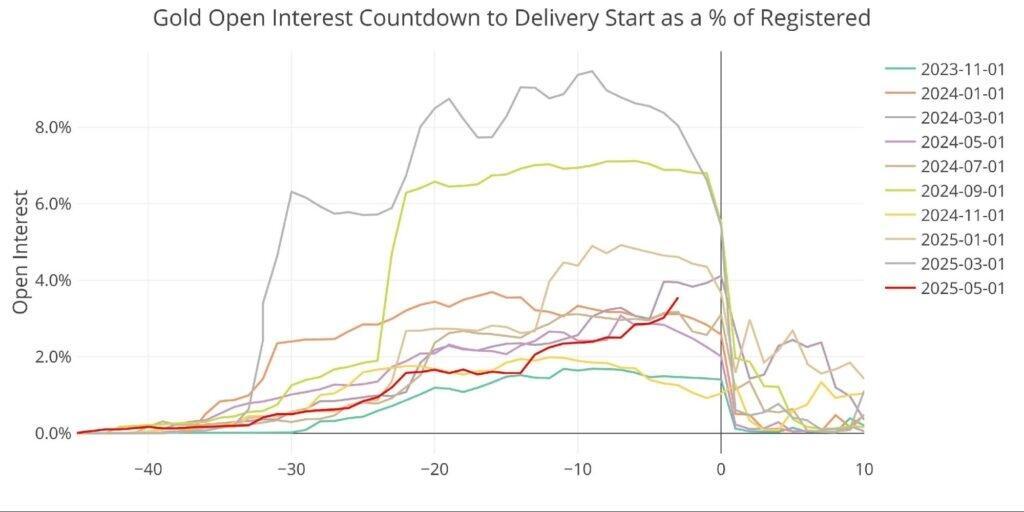 Once gold and silver were announced to be excluded from tariffs, people started suggesting that the arbitrage would collapse and movement of gold from London to the US would be halted. While inventory levels have stabilized and even dropped some, demand for futures and physical delivery is not slowing. First, as shown above, April was a huge month. As we approach May, we are seeing an increase of demand into the delivery period. See chart below.