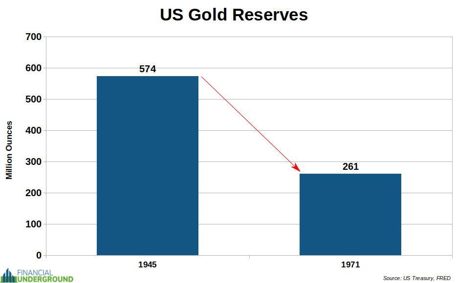 As a result, the US gold supply dropped by more than half, from 574 million troy ounces at the end of World War II to around 261 million troy ounces in 1971.